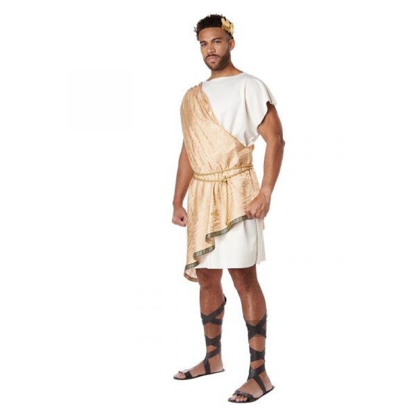 Attract your goddess in Toga Greek God Adult Costume. Be Adonis, the god of beauty and attraction or Plutus, the god of abundance and wealth. Combine them and be your own god creation. This men’s toga includes a cream colored tunic shirt, a shimmering gold fabric shoulder drape, a golden rope waist tie, and a headband with fabric gold leaf decoration.