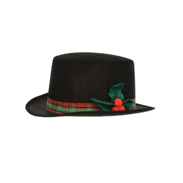 Caroler Hat Christmas Accessory – Black Felt w/ Red Plaid Band and Holly pom poms is a great sturdy, black felt hat to wear to a Christmas party or to go caroling! You could also use it for a Frosty the Snowman or other decoration.