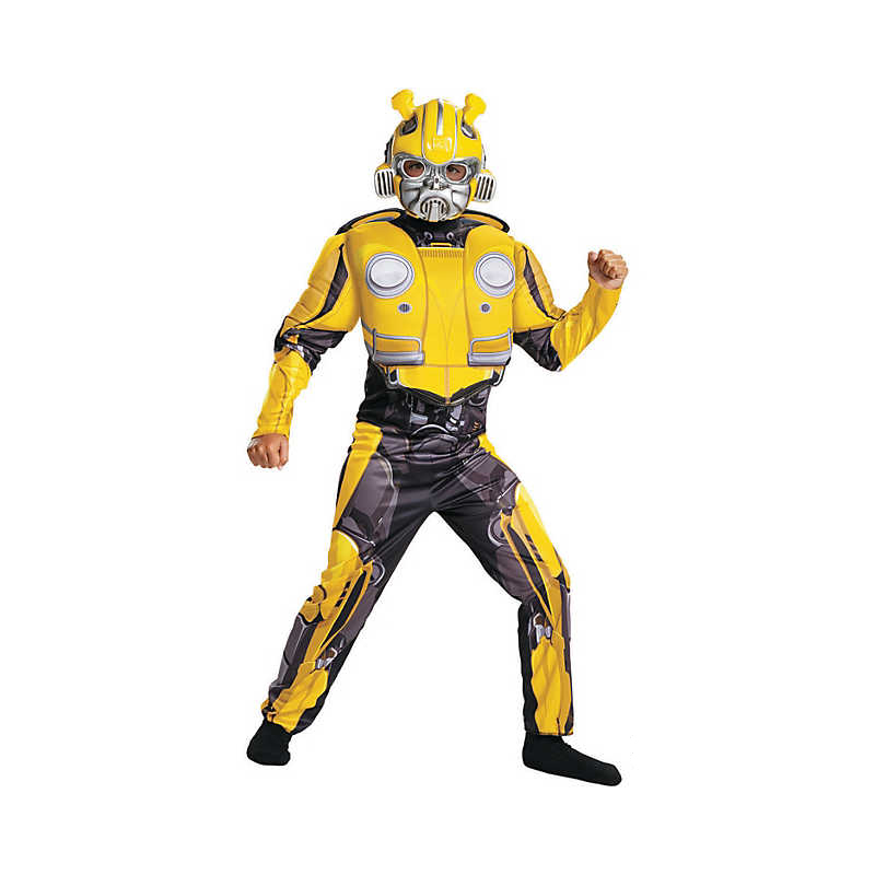 Transformers Bumblebee Child Halloween Costume includes jumpsuit with muscle torso and arms, attached 3D back pieces and character mask.