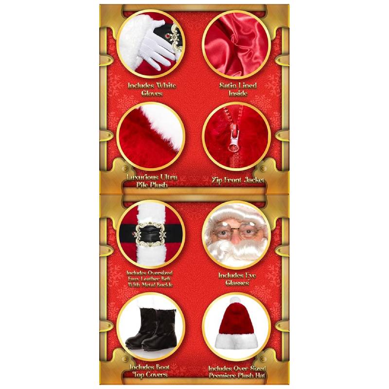 Make a list and check it twice, the Ultra Plush Professional Santa Suit will keep you best dressed for Christmas cheer. The set features a jacket with a zipper closure, ribbon and plush trim, as well as a hat and ¾ length pair of pants. It also includes: belt with decorative buckle, pair of boot toppers with plush trim, pair of white gloves, novelty prop glasses, belly-stuffer holder and finally a wig, beard and moustache set. The beard has ear loops while the moustache has an adhesive patch (additional adhesive may be required). The belly-stuffer holder can be filled with a pillow or a similar item (pillow not included). Christmas bag sold separately.