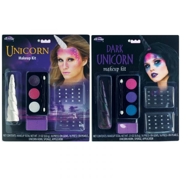 Unicorn Make-Up Kit w Horn, available in light or dark unicorn shades, features .21 oz of powdered makeup. Also includes 32 press-on gems in the Dark Unicorn or 16 gems and 16 pearls in the light unicorn kit, sponge and applicator.