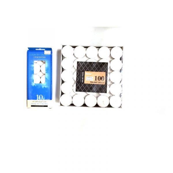 Unscented Tea Light Candles are white with a silver foil bottom. They come in a package of 10 or 100. Burns up to 4 hours.