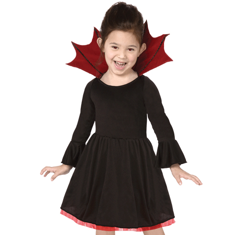Costume includes Black dress with stiff black interfacing in the skirt and red tulle trim. The dress has a stand up red velvety vampire collar