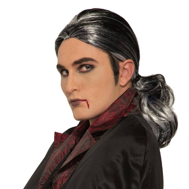 Vampire Gothic Prince Wig is a modern vampire style wig. It is black hair brushed back with gray streaks on either side. Wear it for Halloween, themed parties, drag, productions and horror houses.
