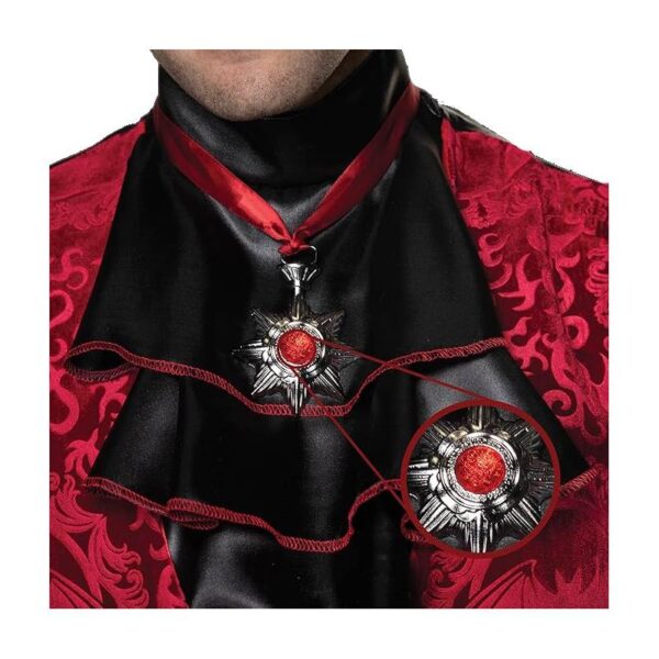 This deluxe classic silver tone and red medallion has a red plastic “gem” in the center and hangs from a red woven ribbon. Perfect for your Classic style vampire costume.