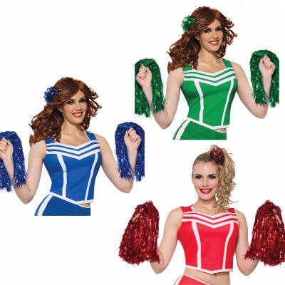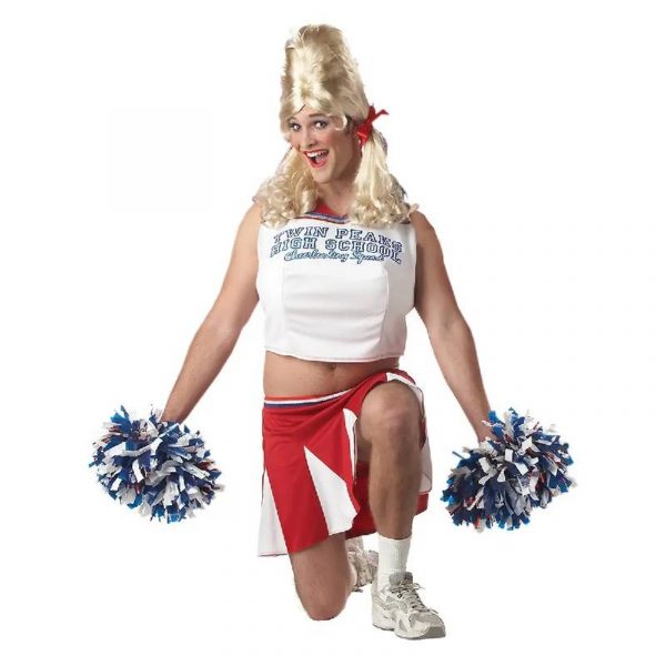 Varsity Cheerleader Adult Costume wins the cheer competition every year. This costume includes a crop top with “TWIN PEAKS HIGH SCHOOL CHEERLEADING SQUAD” written across the chest, a pleated red and white skirt, inflatable chest piece and two blue/white pom poms.