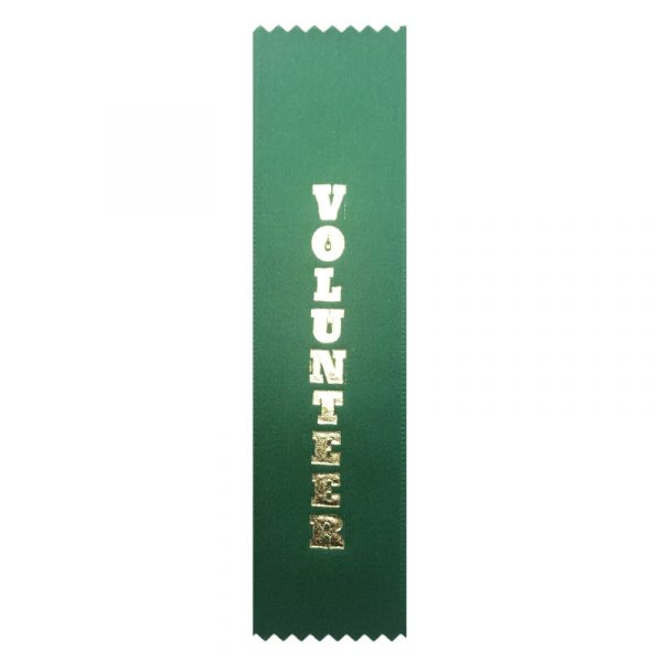This flat award ribbon is green with gold print. It measures approximately 2″ wide by 7″ long. It can be fastened with a straight pin or safety pin; these are not included.