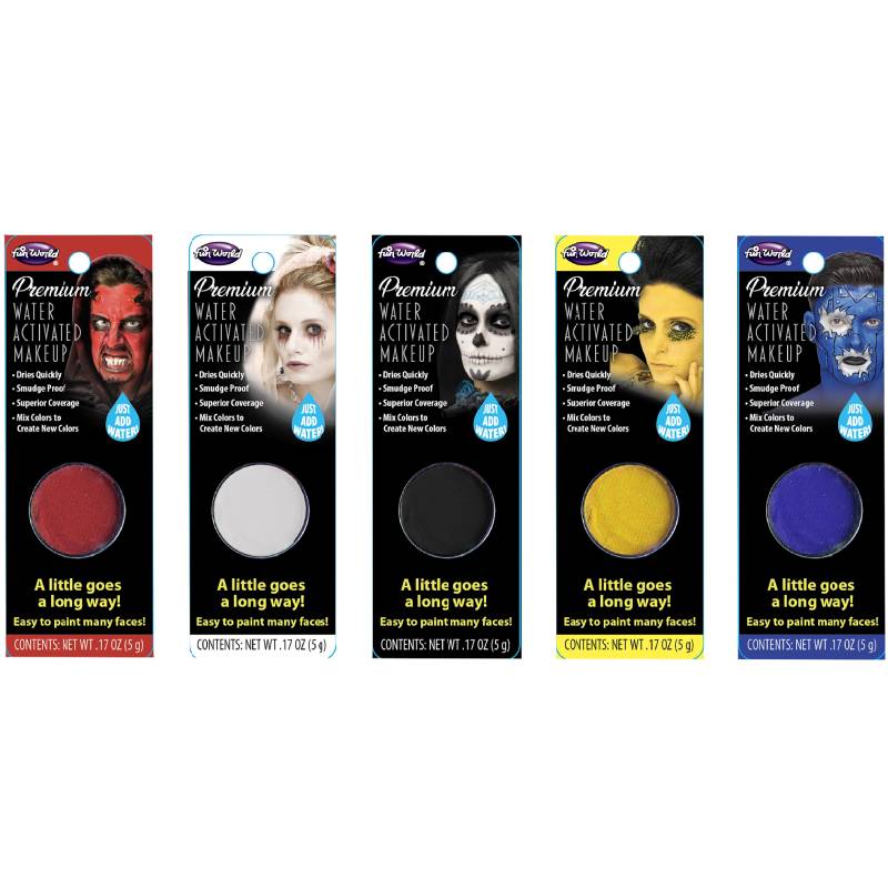 Water Activated Makeup comes in individual color cups. Use these for Halloween, cosplay, drag, theatrical productions, and more.