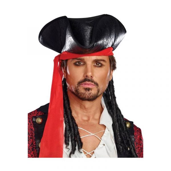 Caribbean pirate hat. Adult size. Made of dark, weathered looking fabric with red scarf and hair. Wear this for a Jack Sparrow look!