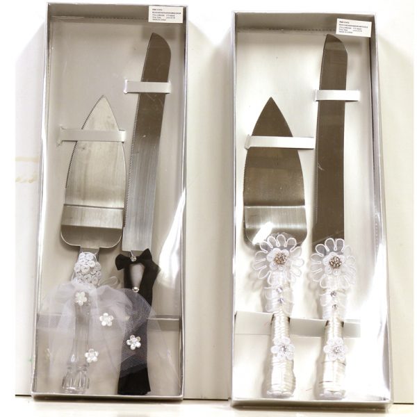 Choose from two styles of beautiful Wedding Cake Knife & Server Sets. One set features the knife decorated in a groom’s tuxedo and the server in a wedding gown! The other set features both pieces decorated in bridal white with rhinestones.