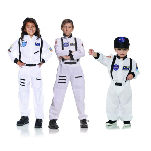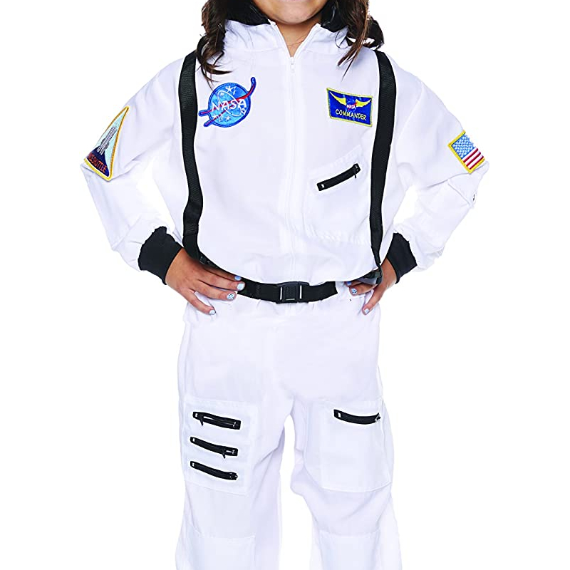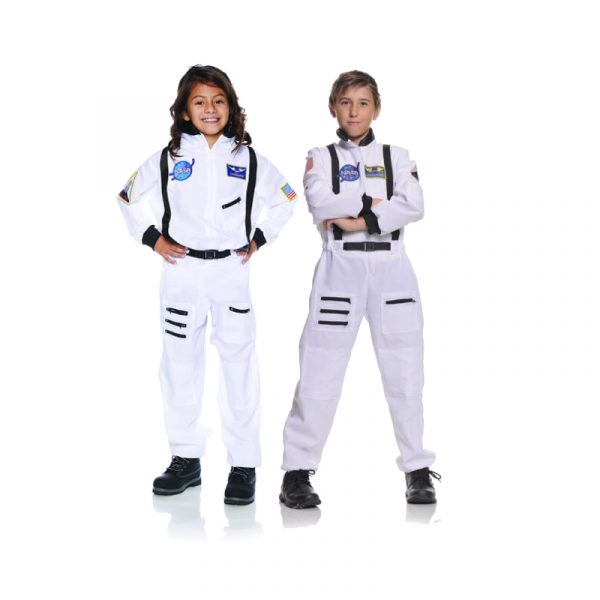 White Astronaut Costume for Kids is a very good looking Jumpsuit. Wear this for Halloween or dress up for school projects. This costume is for children. It has embroidered patches on it that say NASA and NASA Commander. There is a patch on the sleeve that says “SPACE SHUTTLE” and an American Flag Patch on the other sleeve. The black zippers and a belt are good accents for the costume.