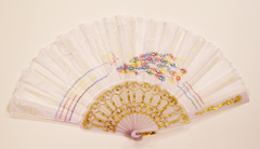 This fan has embroidered designs and a peacock in the center. The tail of the bird is done in multi colored thread. The framework is made of white plastic and highlighted with gold metallic designs. There is a gold-tone metal loop at the bottom of the fan. It is approx. 9″.