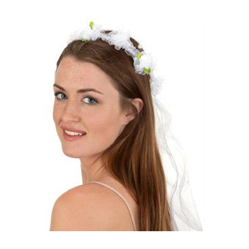 White Net Veil with Flowers Halloween Costume Accessory is a circular band that sits on top of your head. Flowers in the front. Netting on one side; based on your preference the netting can hand in the front or back.