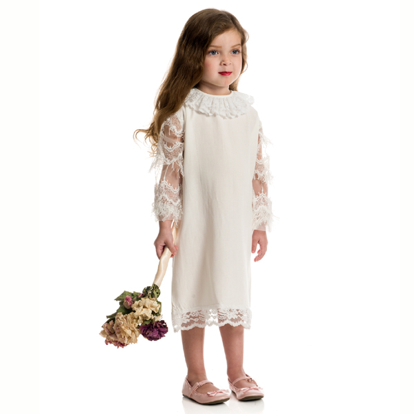 Wicked Doll. Off white dress with lace hem, collar, and sleeves. The lace on the sleeves appears torn.