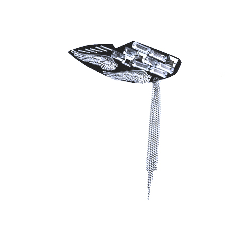 This wing-shaped epaulet features both a pin and a clip to attach to your clothing. It is black felt with crystal beads sewn on it and a pair of silver wings.