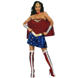 Wonder Woman Superhero costume includes dress, boot tops, cape, tiara, and gauntlets. It is available in ladies small, medium, and large.