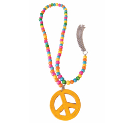 Hippie Wooden Beaded Peace Sign Necklace. Multi-color Beads, natural emblem. The wooden beads are painted various colors and a peace sign dangles from this necklace.
