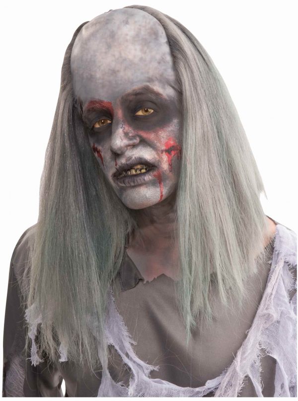 Zombie Wig features a long gray straight hair on a gray bald cap. Cap can be made to match existing skin tones using makeup. The Zombie Wig will lead you on your way to looking like the perfect grave robber! One adult size.