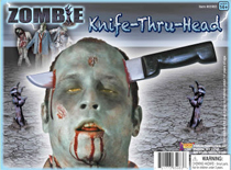 - thin black headband has knife handle on one end and tip of blade on the other end